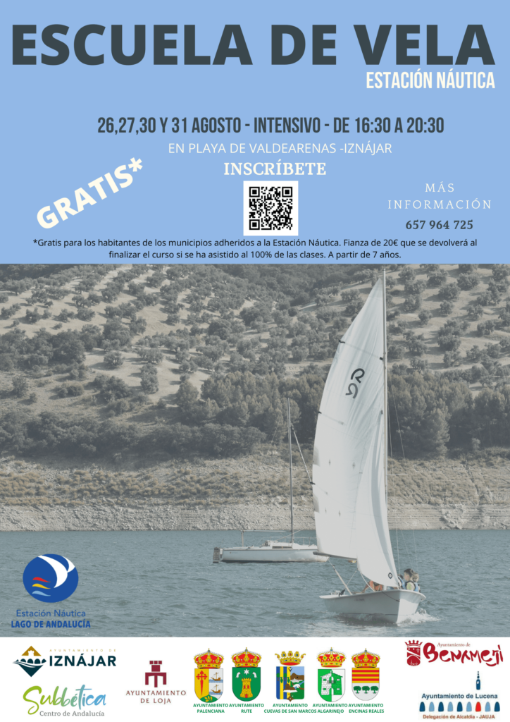 El plato fuerte de la II Semana Náutica se presenta con un curso intensivo de vela, que se realizará los días 26, 27, 30 y 31 de agosto de 16:30h a 20:30h. Este curso es gratuito, y está dirigido a niños y adultos a partir de 7 años. En él, podrán se podrán aprender nociones básicas de navegación en el Lago de Andalucía. Haz clic aquí para inscribirte en el curso de vela.